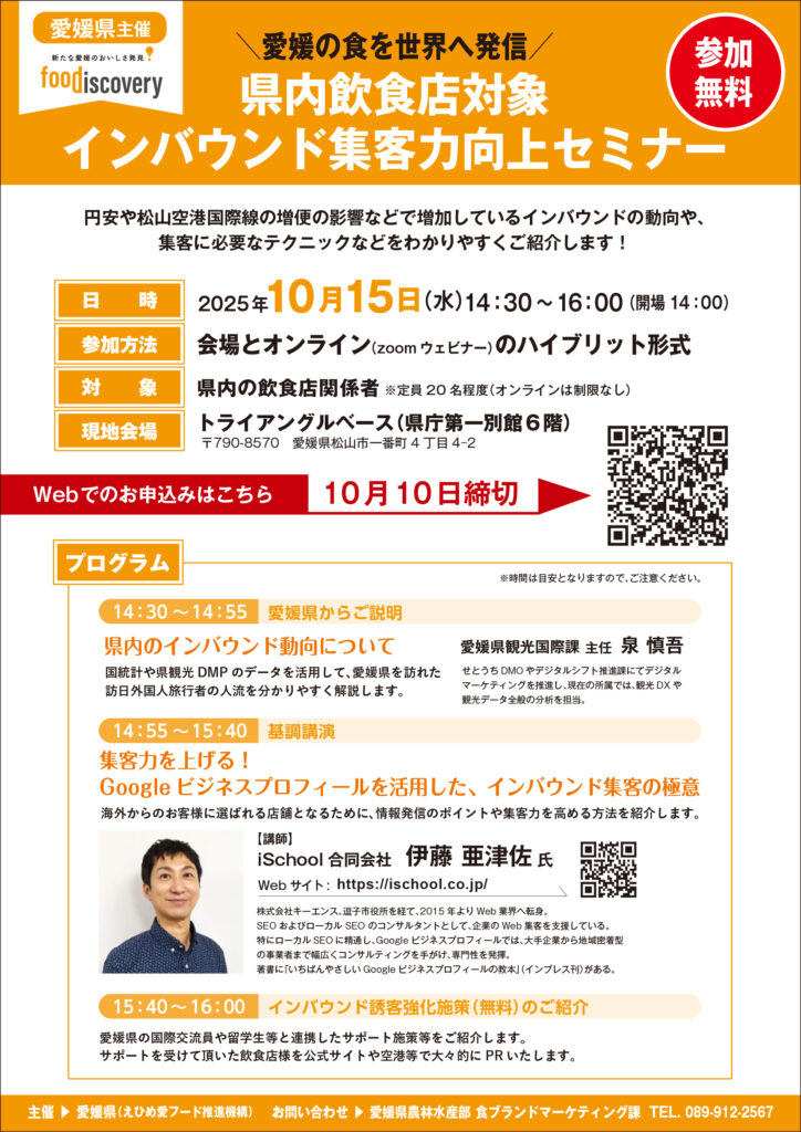 お知らせ 【飲食店様必見】県内飲食店対象インバウンド集客力向上セミナー開催のお知らせ(参加無料) 愛媛県(えひめ愛フード推進機構)では、円安や松山空港国際線の増便の影響などで増加しているインバウンドの動向や、集客に必要なテクニックなどをわかりやすくご紹介するセミナーを開催いたします。参加無料ですので、お気軽にお申込みください! <事前申込制> お申込みはこちら ※会場かオンラインを選択できますが、会場収容人数は限りがありますので、お早めにお申し込みください。 お知らせ一覧